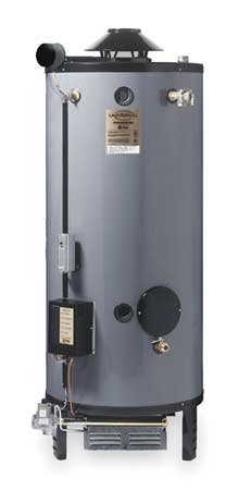 HeavyDuty Commercial Water Heater, Gas, Tank 100 Gal., LP, Input 199,900 BTU, Jacket Dia. 30 1/4 In., Height/Top of Vent Connection 73 1/16 In., Draft Hood Size 6 In., Height/Top of Heater 66-1/8 In., Gas Connection 3/4 In., Recovery @ 100 F Rise 194 GPH, Spark To Pilot, Voltage 120V, Max. Pressure 150 PSI, Temp. Range 100 To 180 Degree F, Includes Automatic Flue Damper, Full Port, Full Flow Brass Drain Valve, Warranty Length 3 Year Limited Tank Warranty, 1 Year Limited Warranty On Parts ...Read more |